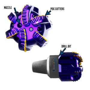 Drill bit nozzles help clear the cutting area and cool the Polycrystalline Diamond Composite (PDC) cutters.