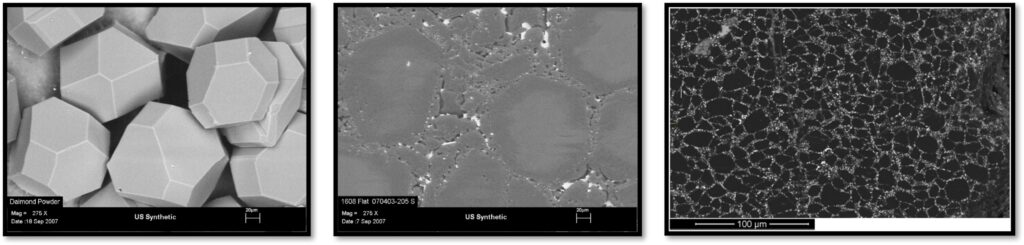Below are images showing loose diamond particles and joined diamond grains after the pressing process. Cobalt can be seen as white specks between the black visible diamond grains.