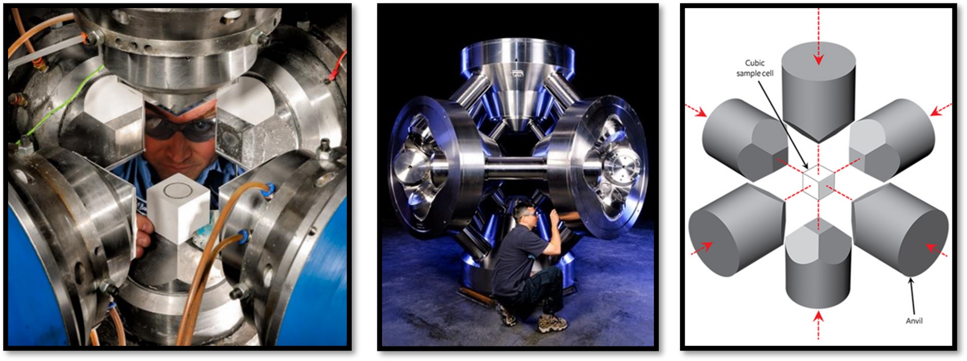 The cubic press uses 6 anvils which converge to create pressures higher than 1,000,000 PSI, but this pressure alone is not enough to create diamond.