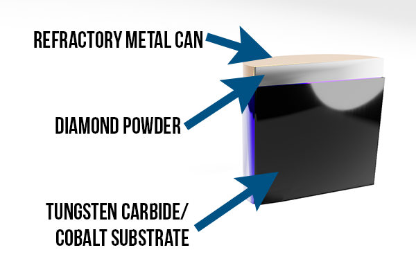 The diamond is secured to the metal substrate during the pressing process. Before the grit is pressed it is put into a refractory metal can along with the tungsten carbide and cobalt.